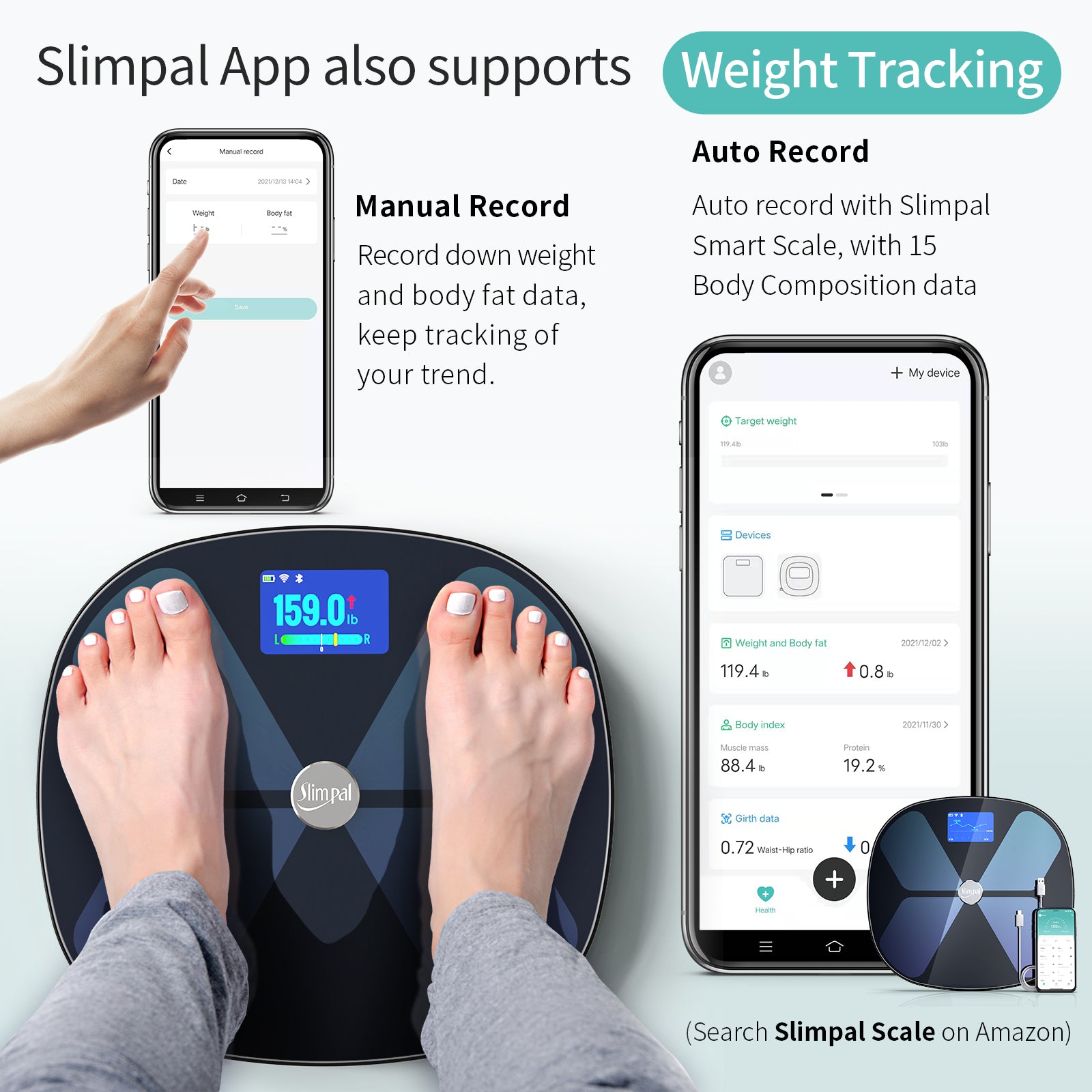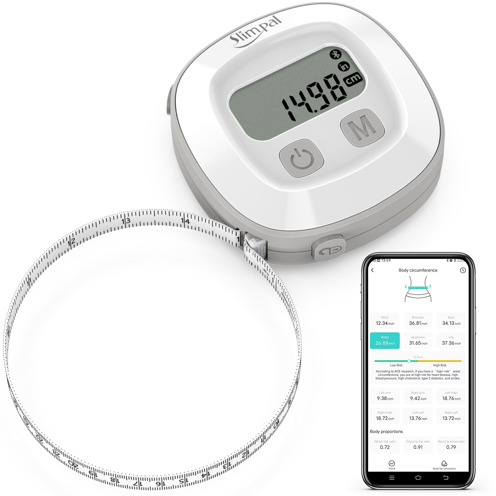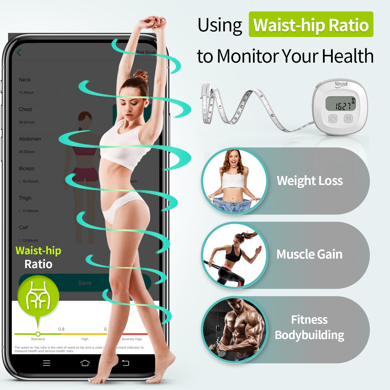 - [App Tracks Your Waist-to-Hip Ratio ] Smart Body Measuring Tape pairs with Slimpal APP via Bluetooth. You can easily record down your data on app, it will record your measurements and visualize your waist-to-hip ratio process by graphing. Track the changes in your body composition, using waist-to-hip ratio to establish a clear picture of overall health.